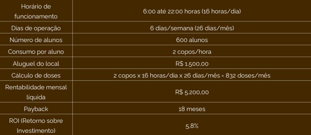 Neste cenário, temos uma estrutura mais robusta: uma academia maior, com funcionamento diário e maior adesão dos alunos ao consumo. A projeção mostra uma rentabilidade bem mais expressiva, com retorno acelerado do investimento e margem sólida. É um modelo voltado para locais de alto fluxo, em que a máquina consegue atingir seu potencial comercial com mais intensidade.