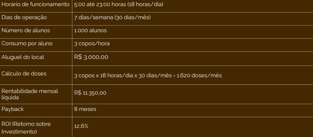 Este cenário considera uma academia de porte médio, com fluxo constante de alunos e funcionamento em horário comercial estendido. A projeção é mais cautelosa, assumindo um consumo moderado por aluno ao longo do mês. Mesmo com custos de aluguel do espaço, a operação já demonstra capacidade de gerar lucro mensal consistente, garantindo segurança ao investidor e retorno em médio prazo.